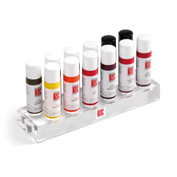 O suporte de acrílico de alta qualidade M com o logotipo Swiss Color® oferece uma fixação segura para 12 tons de pigmento. Um destaque decorativo para o seu estúdio.